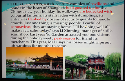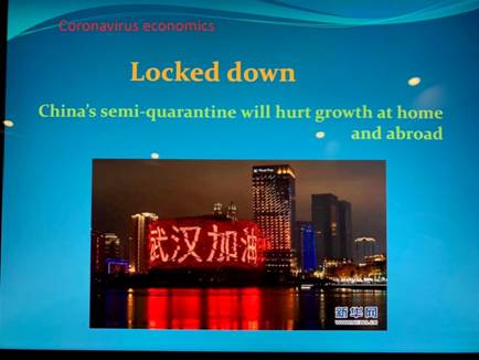 这个星期的综合英语课,我抛开了课本,另外选择了一篇《经济学人》中的文章---Coronavirus economics(病毒经济学)。之所以选择这篇文章,不仅仅因为它的内容非常贴合我们当下的经历,更重要的是我想通过这篇文章告诉员工们:疫情虽然对中国的经济产生了极大的负面影响,但是我们依然要坚定信念,期待未来;疫情并不可怕,可怕的是我们看不到这场战斗中凝聚的希望和力量。讲完文章,依然意犹未尽,随即从网上找到了几张西南联大的照片,并告诉员工们,西南联大是世界教育史上极为光彩的一笔,面对日寇的侵袭,短缺的物资,艰苦的环境,前辈们依然孜孜不倦,潜心向学,成就了大批的学术泰斗和两位诺贝尔奖获得者,这种精神在目前的形势下更值得我们学习和思考。清华大学前董事长梅贻琦在回答员工“什么是真实”的问题时说到:“你看到什么,听到什么,做什么,和谁在一起,有一种从心灵深处满溢出来的不懊悔、也不羞耻的平和与喜悦,这就是真实。”我把这段话写在了我的PPT最后一页,我想告诉员工们,虽然远离尘嚣,但老师希望他们依然能够内心笃定,从容平和,不忘初心,砥砺前行。只有真实地感受到内在的平静,才能更好地思考自己的当下和未来,思考应该怎样度过这一生。等到春暖花开,回归校园的时候我们再回首这个令人难忘的寒假,不会因为虚度年华而悔恨,不会因为碌碌无为而羞耻。
