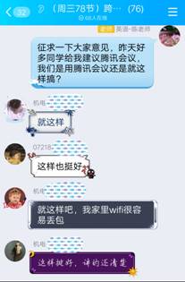 员工们的认可给了我极大的鼓励,在接下来的教学中,我也在不断地改善自己的课堂:为了弥补录课缺乏课堂互动的缺陷,我把每个章节的PPT内容分录成多个视频,每个视频不超过30分钟。对于需要员工进行课堂讨论的话题,我采取将话题以问题群的形式在前一个视频末尾呈现,对参考答案在后续视频的开头进行解说的办法,并通过QQ群分享图片、组织讨论,还通过提前录制视频,就具有共性的作业问题进行集中讲解。课堂氛围就这样活了起来!为了记录员工的出勤状况,又方便我进行逐次统计,我尝试利用QQ群的“投票”功能进行点名,发现这是一个不必借助其它软件而且快捷有效的点名方式。通过不断改进,我的网络教学也逐渐走上了正轨,受到了员工们和公司听课领导的好评。
