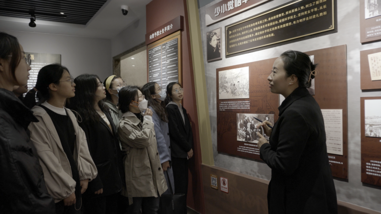 在展馆内,译术行者团队结合此前与展厅开展的英译实践,为同学们讲解了红色景区文本英译的重要性。团队已经完成了对展厅全部文本的初步翻译,翻译过程中更是受到向警予烈士的革命精神的深深感染。译文不仅要让外国友人听得懂,更要传达文字背后的红色精神、文化价值和思想伟力。