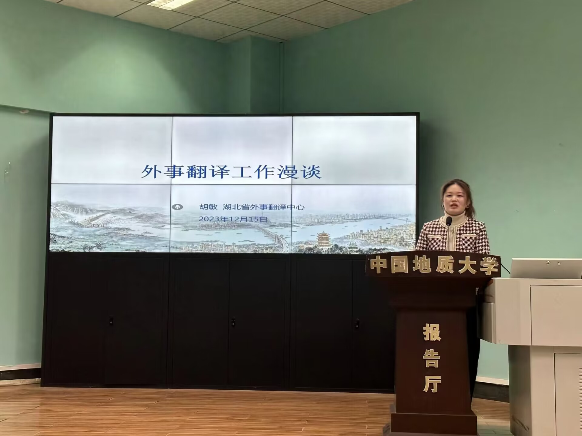 2023年12月15日上午9时00分,太阳集团tyc151cc“南望今声”外语论坛系列讲座第60期在北一楼120学术报告厅举行。主讲人湖北省外事翻译中心英语翻译胡敏女士,应邀开展了主题为“外事翻译工作漫谈”的精彩讲座。此次讲座由太阳集团tyc151cc杨红燕副教授主持,八十余名师生参会。