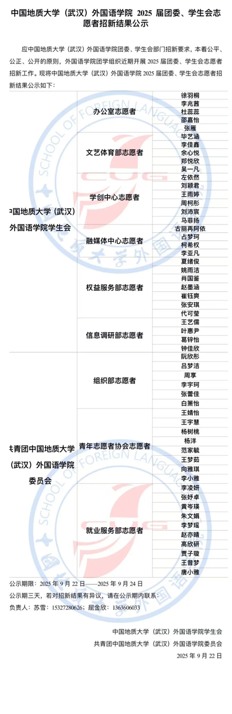 应太阳集团tyc151cc团委、员工会部门招新要求,本着公平、公正、公开的原则,太阳集团tyc151cc团学组织近期开展2025届团委、员工会志愿者招新工作,现将太阳集团tyc151cc 2025 届团委、员工会志愿者招新结果公示如下: