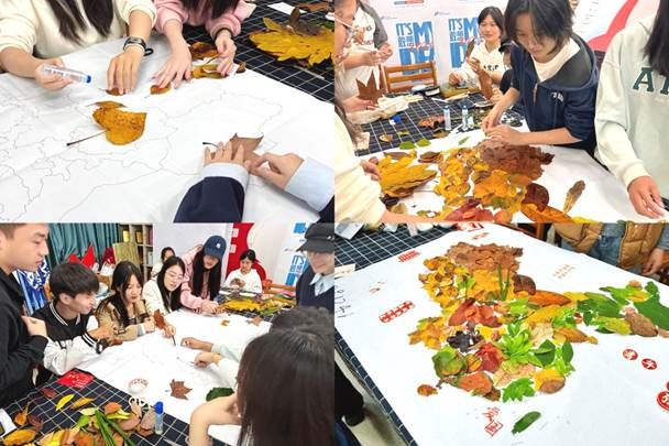 在“逐秋游园”环节,同学们以宿舍为单位在校园内收集秋叶,返回教室后共同协作,用片片秋叶拼贴出完整的中国地图。这一创意环节,既展现了自然之美,更寓意着青年一代以青春装点山河、共护锦绣中华的共同信念。