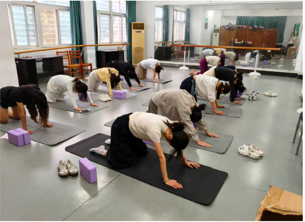 活动伊始,老师带领大家进行了系统的热身环节。从简单的颈部、肩部、手臂伸展开始,再到腰背和腿部的舒缓拉伸,循序渐进地唤醒身体各个部位,让同学们慢慢进入瑜伽的节奏。