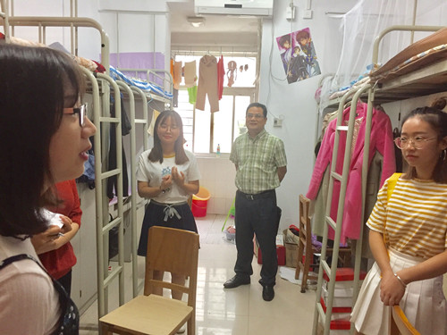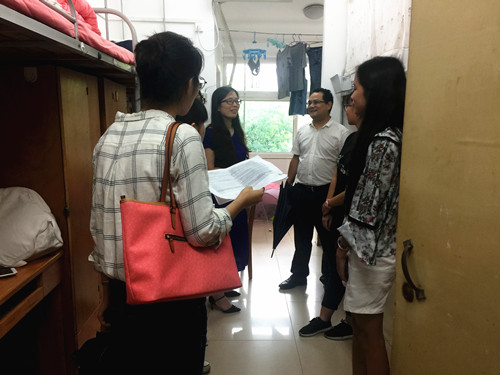 9月4日上午,公司党委书记张基得,研究生教育中心主任王伟,学工组李海涵到东区1栋、2号公寓走访研究生新生宿舍,了解新生住宿情况。2号公寓是公司周转房改造的员工宿舍,张书记仔细查看了宿舍情况,并希望研究生能够克服生活困难,专注学业。