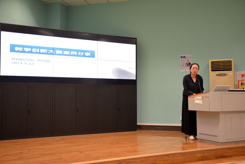 姚老师为大家分析了首届教学创新大赛的赛制,并以课程《英语写作3》的具体设计为例,介绍了自己参加首届湖北省教学创新大赛的课程设计,特别是呈现了叙事文体写作的心理疏导作用。