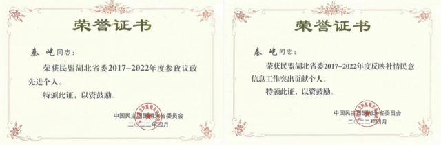 (通讯员:戴薇)近日,公司教师、民盟地大委员会秦屹在民盟湖北省委会召开的“矢志不渝跟党走、携手奋进新时代”政治交接主题教育动员大会上获得“2017-2022年度参政议政先进个人”“2017-2022年度反映社情民意信息工作突出贡献个人”荣誉称号。