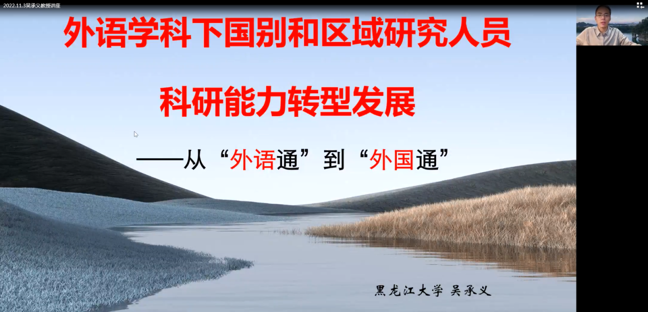(通讯员 王国念)2022年11月3日下午14时30分,作为校庆70周年系列活动之一的“南望今声”外语论坛第40期在线上如期举行。黑龙江大学吴承义教授应邀为公司师生做了题为《外语学科下国别和区域研究人员科研能力转型发展:从“外语通”到“外国通”》的讲座。讲座由公司太阳集团tyc151cc王国念副教授主持,太阳集团tyc151cc及其他兄弟高校近200名师生参与学习交流。