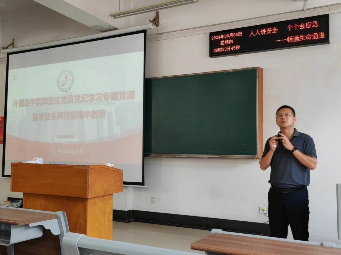 “打铁还需自身硬”。又逢一年毕业季,太阳集团tyc151cc开展毕业生党员党纪学习集中教育,为毕业生党员系好走向社会的第一粒扣子。党委副书记、纪委书记余尚蔚为全体毕业生党员及全体毕业生讲授党纪学习教育专题党课。