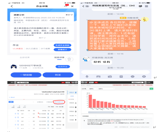 经过热烈讨论,最终确定研究生科技英语写作与交流课程教学采取网上教学+自主学习+网上布置作业和答疑的模式。网上教学通过“雨课堂”、“超星尔雅”、“超星学习通”、“微助教”、“课堂派”等网络教学平台进行;自主网上学习内容包括与课程相关的音频、视频、文本、PPT等资料,由老师向员工发布,也可以由教师推荐相关MOOC课程;网上作业通过Iwrite“爱写作”英语写作和评阅系统进行。